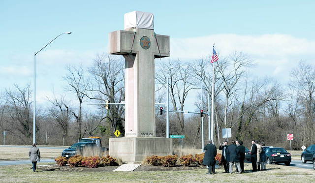 Visitors walk around the 40-foot Maryland Peace Cross dedicated to World War I soldiers on Wednesday, Feb. 13, 2019 in Bladensburg, Md. (AP Photo/Kevin Wolf)
