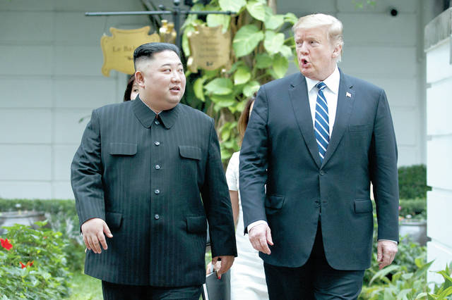 U.S. President Donald Trump and North Korean leader Kim Jong Un take a walk after their first meeting at the Sofitel Legend Metropole Hanoi hotel, Thursday, Feb. 28, 2019, in Hanoi. (AP Photo/Evan Vucci)
