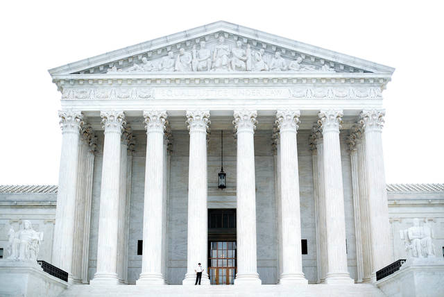 In this Oct. 9, 2018 photo, police office guards the main entrance to the Supreme Court in Washington. (AP Photo/Pablo Martinez Monsivais)