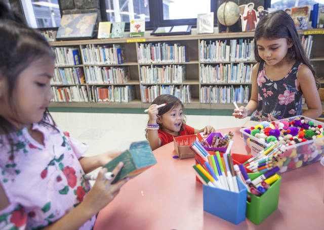 Aurora Pascual, 7, Taylia Ng, 3, and Rebeca Ng, 9, decorate and build a cardboard car craft Feb. 20 during the after-school Imaginarium at Hilo Public Library.