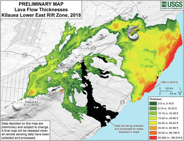 This preliminary thickness map of Kilauea Volcano’s 2018 lower East Rift Zone lava flows was calculated by subtracting pre-eruption ground surface elevations from post-eruption ground surface elevations mapped with USGS unmanned aerial system (drone) flights. The drones acquired 2,800 aerial photos from which 1.5 billion common points were automatically selected by Surface-from-Motion software. It is still preliminary because additional ground control points are needed to finalize the map. This USGS map is also posted on HVO’s website at https://volcanoes.usgs.gov/volcanoes/kilauea/multimedia_maps.html.