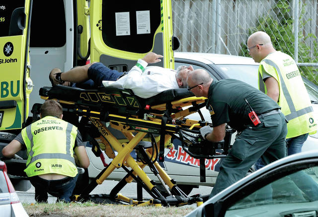 Ambulance staff take a man from outside a mosque in central Christchurch, New Zealand, Friday, March 15, 2019. Multiple people were killed in mass shootings at two mosques full of worshippers attending Friday prayers on what the prime minister called “one of New Zealand’s darkest days,” as authorities detained four people and defused explosive devices in what appeared to be a carefully planned attack. (AP Photo/Mark Baker)