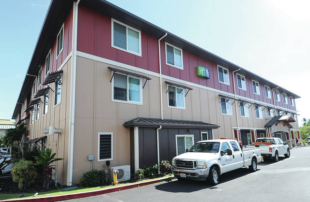LAURA RUMINSKI/West Hawaii Today The current sign at the Holiday Inn Express on Sarona Road in Kailua-Kona hangs as the hotel continues to wait for approval to hang the franchise’s trademark sign.