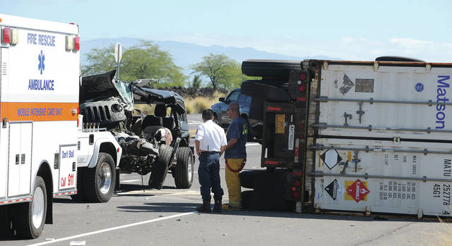 The Hawaii Fire Department received a report at 8:53 a.m. that a DHX-Dependable Hawaiian Express truck hauling a Matson Ocean Services trailer was traveling southbound on the highway when a Jeep attempted a left-hand turn to the northbound lane from Kaupulehu Drive. The truck swerved to avoid the Jeep but was unable to avoid collision.