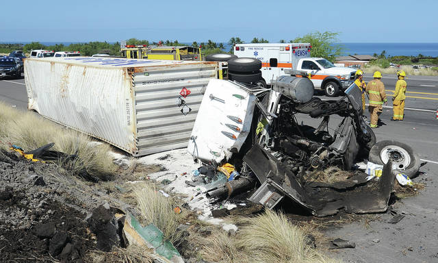 Capt. Eric Loyola with the fire department’s South Kohala station, who acted as commander at the scene, said all three suffered minor injuries. He added the split-second driving skills of the tractor-trailer driver, who self-extricated from the vehicle’s mangled cab, prevented a much worse situation.