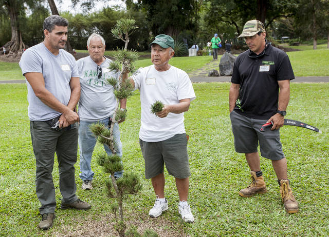Dennis Makishima teaches a pruning workshop Tuesday at Liliuokalani Gardens in Hilo. The two-day workshop was shaped for park maintenance personnel and active landscapers. Makishima is the founder of the aesthetic tree pruning program at Merritt College in Oakland, Calif., and past president of the Golden State Bonsai Federation. He used to come to Hawaii annually to help with the bonsai show at the Okinawa Festival in Honolulu. Now retired, Makishima is working on clients’ trees during two weekends on Oahu and in between returned to Hilo to teach the workshop Monday and Tuesday.