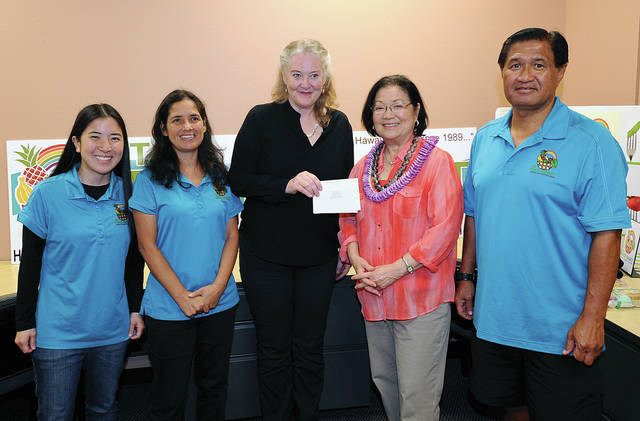 The Hawaii Democrat on Wednesday presented a check to The Food Basket Executive Director Kristin Frost Albrecht that’ll cover the purchase of enough rice to feed 450 families.