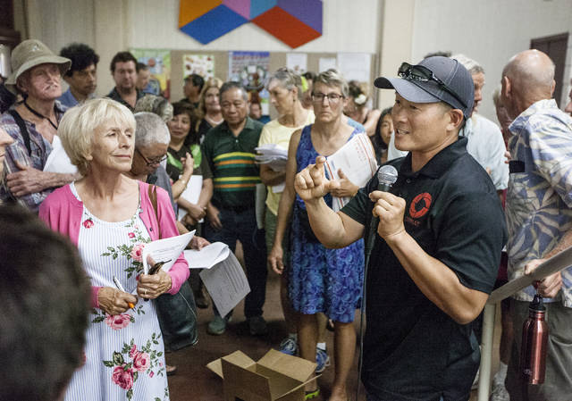 During a meeting Friday evening in Pahoa, Puna Geothermal Venture officials provided residents and farmers with waivers to sign so they can use a “pioneer road” the power plant built over the lava channel from last year’s Kilauea eruption.