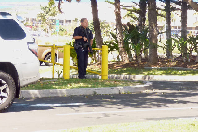 West Hawaii Today photo Hawaii Island police officers responded Friday morning to the Kailua-Kona Lowe’s after receiving a tip that Walter Gomes III might be in the area. As an officer, pictured, stood at the main entrance holding a rifle and scanning the parking lot, other officers checked the parking lot and vehicles, as well as the store for any sign of the wanted man. The sighting was ultimately not confirmed, one of the officers said before leaving the scene about 25 minutes later. In all, at least seven patrol cars responded to the report. Lowe’s remained open throughout.