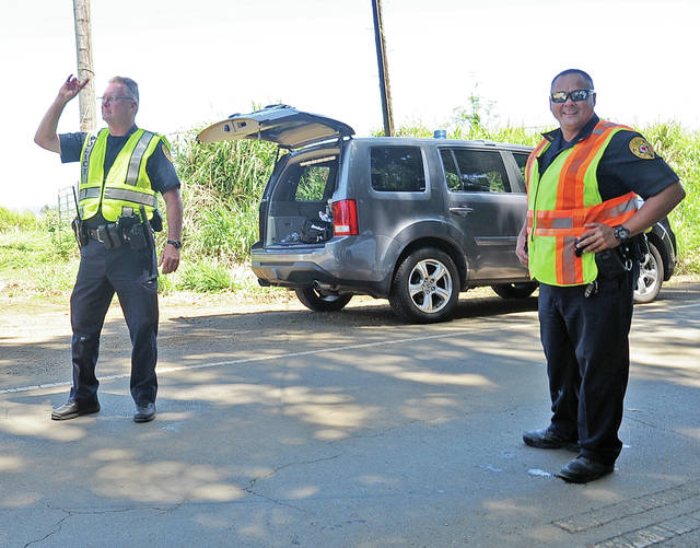 LAURA RUMINSKI/West Hawaii Today Officers turn around traffic on Akoni Pule Highway at Iole Road on Wednesday afternoon because of an active shooter situation.
