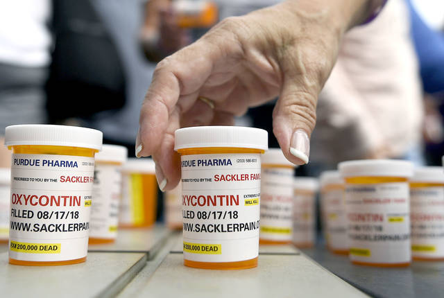 FILE - In this Aug. 17, 2018 file photo, family and friends who have lost loved ones to OxyContin and opioid overdoses leave pill bottles in protest outside the headquarters of Purdue Pharma, which is owned by the Sackler family, in Stamford, Conn. New York is suing the billionaire family behind Oxycontin, alleging the drugmaker fueled the opioid crisis by putting hunger for profits over patient safety. (AP Photo/Jessica Hill, File)