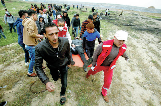 Medics and protester evacuate a wounded youth, who was shot by Israeli troops from near the fence of the Gaza Strip’s border with Israel, while marking first anniversary of Gaza border protests east of Gaza City, Saturday, March 30, 2019. Tens of thousands of Palestinians on Saturday gathered at rallying points near the Israeli border to mark the first anniversary of weekly protests in the Gaza Strip, as Israeli troops fired tear gas and opened fire at small crowds of activists who approached the border fence. (AP Photo/Abdel kareem Hana)