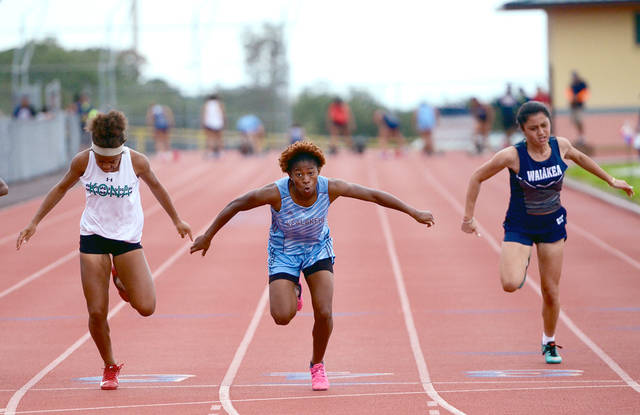 JARED FUJISAKI photo Kealakehe's Saidah Muhammad wins the 100-meter dash Saturday at Keaau High, edging Konawaena's Caiya Hanks, left.