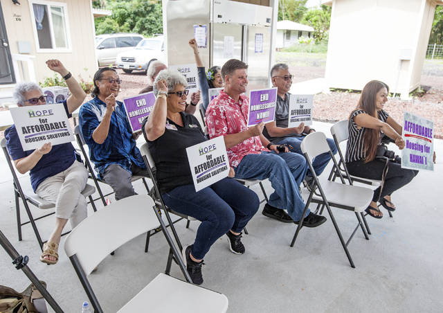 HOLLYN JOHNSON/Tribune-Herald Members of Bridging the Gap cheer Tuesday at Sacred Hearts Shelter (Mirco Units) in Pahoa for affordable housing solutions and an end to homelessness.