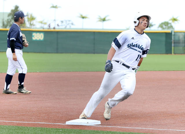 TIM WRIGHT/Tribune-Herald Kamehameha's Braeden Coloma, rounding the bases after hitting a home run Saturday against Waiakea, has two more hits Wednesday as the Warriors beat Honokaa 11-3.