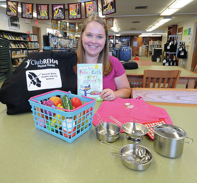LAURA RUMINSKI/West Hawaii Today Library assistant Stacy Bisgard displays items from one of the Discovery Bags available at the Kealakekua Public Library.