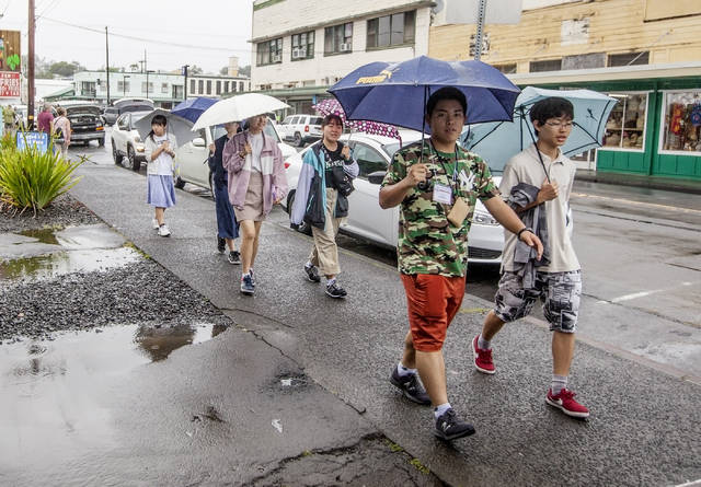 HOLLYN JOHNSON/Tribune-Herald Umbrella-equipped walkers brave the rain Thursday in downtown Hilo.