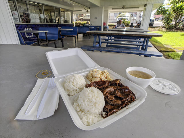 HOLLYN JOHNSON/Tribune-Herald A teri beef lunch plate is served in a Styrofoam container Friday at Blane’s Drive Inn in Hilo.