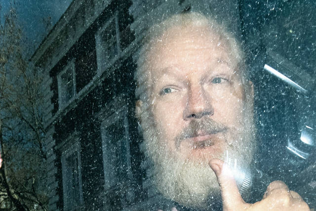 Julian Assange gestures as he arrives at Westminster Magistrates’ Court in London, after the WikiLeaks founder was arrested by officers from the Metropolitan Police and taken into custody Thursday April 11, 2019. Police in London arrested WikiLeaks founder Assange at the Ecuadorean embassy Thursday for failing to surrender to the court in 2012, shortly after the South American nation revoked his asylum .(Victoria Jones/PA via AP)