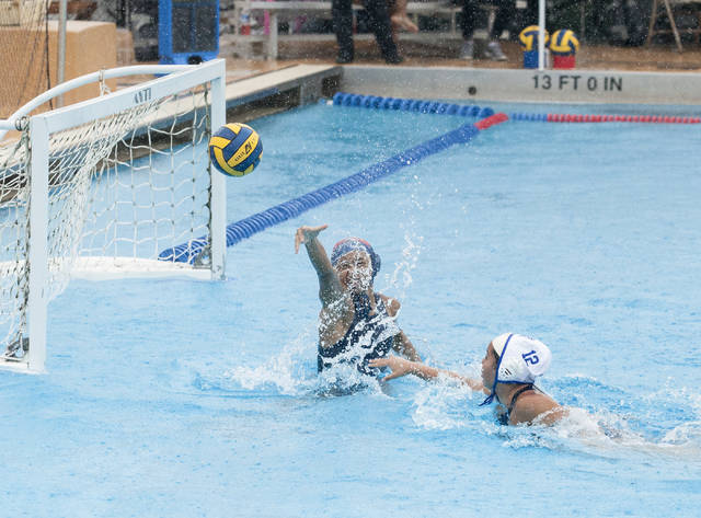 HOLLYN JOHNSON/Tribune-Herald Waiakea's Ashley Rynkewicz shoots on Hilo's Sydney Patterson on Saturday during the Warriors' 13-4 victory at Naeole Pool.