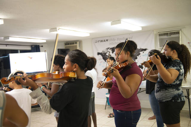 At a Wednesday practice at University of Nations last month, a portion of the group gathered to learn to play the song “Hawaii Aloha,” also called “Ku‘u One Hanau.” The song is still in its beginning stages of development, but once the children master the song on the violin, it will be played in D.C.