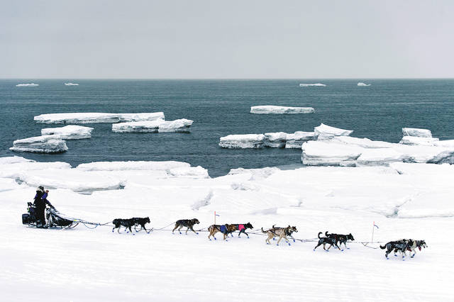 In this March 13 photo, Jessie Royer passes icebergs in open water on Norton Sound as she approaches Nome, Alaska, in the Iditarod trail sled dog race. (Marc Lester/Anchorage Daily News via AP, File)