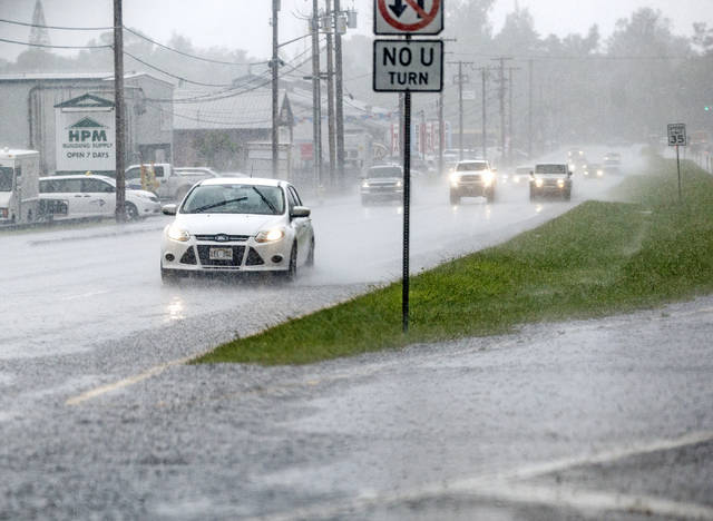 HOLLYN JOHNSON/Tribune-Herald Flash flooding causes puddling along Highway 11 on Thursday in Hilo.