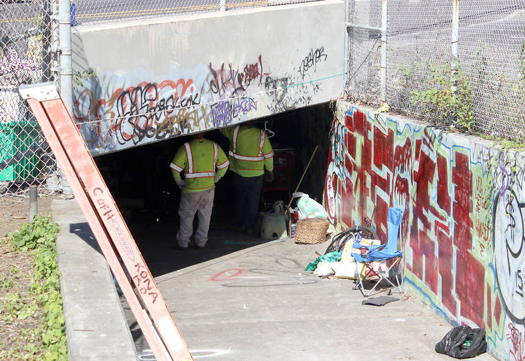 KAILUA-KONA — Hawaii County Highways Divisions crews, Hawaii Island police officers and Hope Services Hawaii employees worked to clear more homeless camps Thursday in the Kailua-Kona area.
