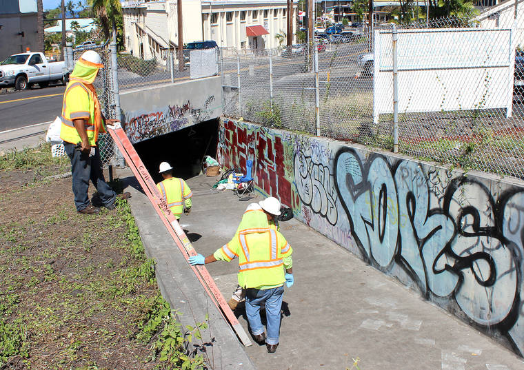 CHELSEA JENSEN/West Hawaii Today Hawaii County Highways Divisions staff on head into a drainage channel on Hualalai Road that runs adjacent to the Hawaii Community Federal Credit Union and under Kuakini Highway and Alii Drive to the ocean to clean debris and other items left by homeless that had taken residence there.