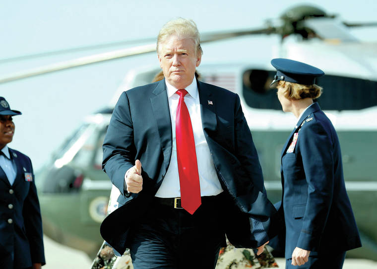 Appearing relaxed earlier Friday at a military event, Trump said a statue he’d been presented with as a memento would have a permanent home “at least for six years, in the Oval Office.”