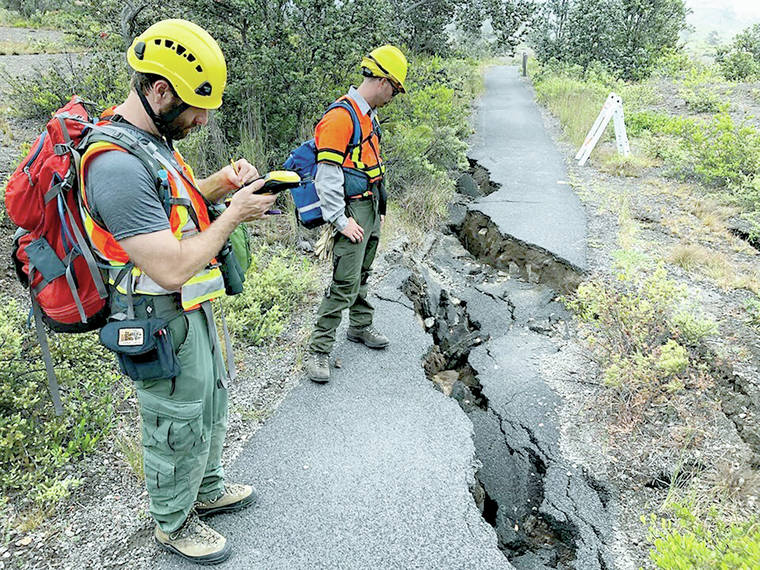 JON CHRISTENSEN/National Park Service photo A team including National Park Service geomorphologist Eric Bilderback logs earthquake damage and assesses stability along Crater Rim Trail on Aug. 31, 2018.