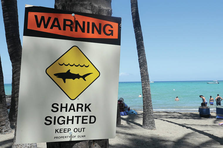 LAURA RUMINSKI/West Hawaii Today A sign warning about a shark in the water is posted Tuesday morning after an attack at Anaehoomalu Bay in West Hawaii.