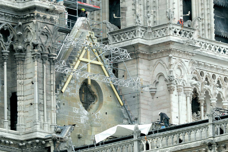 PARIS — Professional mountain climbers were hired to install synthetic, waterproof tarps over the gutted, exposed exterior of Notre Dame Cathedral as authorities raced to prevent further damage ahead of storms rolling in toward Paris.