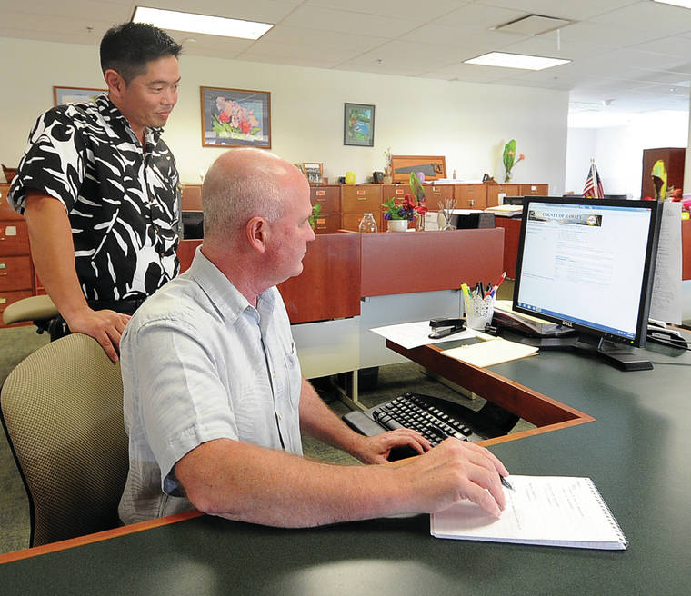 LAURA RUMINSKI/West Hawaii Today Neal Tanaka, acting deputy Building Division chief, left, and Andrew Donovan, acting Building Division chief, work on a computer in the county Building Department at West Hawaii Civic Center.