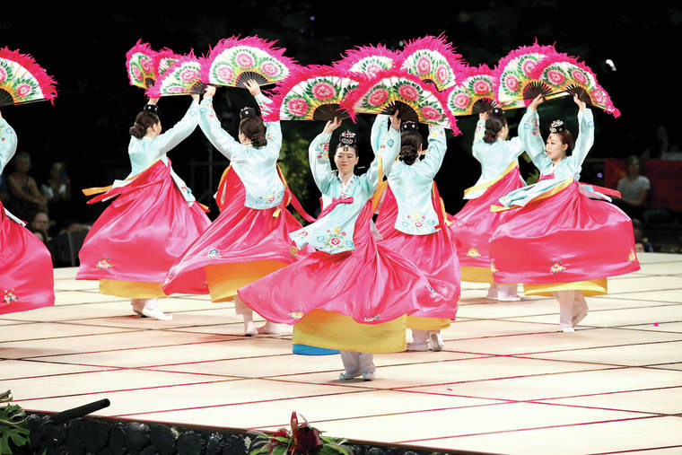 For the first time ever, traditional Korean folk dance was part of the free Wednesday evening program, which is a precursor to the three nights of competition by 23 halau (schools) described as the “Olympics” or “Super Bowl” of hula.
