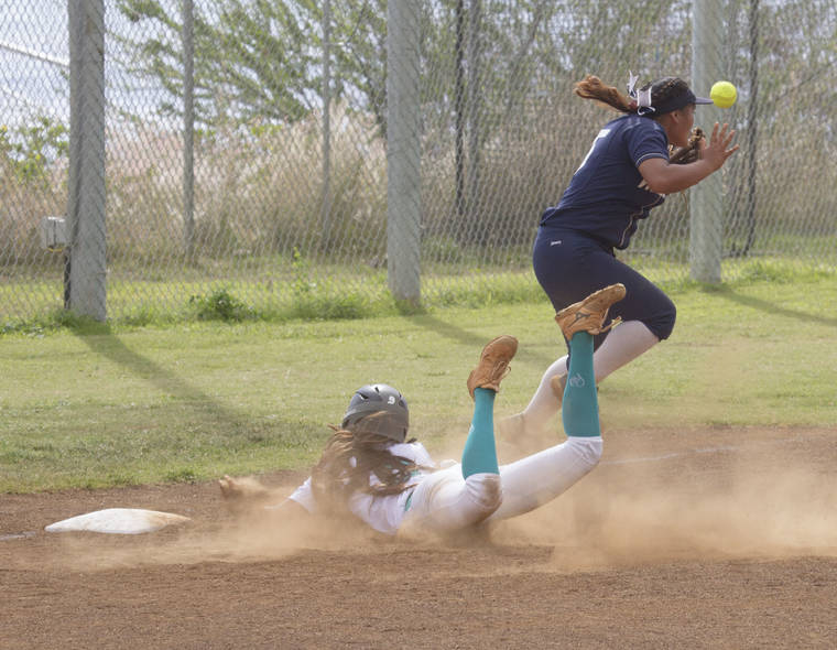 J.R. De Groote/West Hawaii Today Kapolei's Chasity McKean slides into third base Wednesady as Waiakea's Alize Ka'apana tries to corral the throw in an HHSAA play-in game.