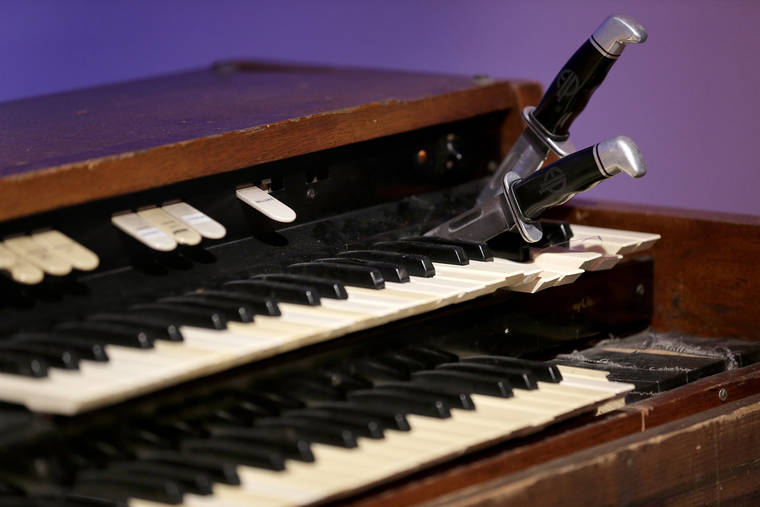 Featured is a fragment of a Hendrix guitar that he set on fire and smashed onstage at the Monterey Pop Festival in 1967; a Gibson SG Special guitar destroyed by Townsend during a photo shoot with Annie Leibovitz for Rolling Stone (and preserved in Lucite); and a modified Hammond L-100 organ used by Keith Emerson as a “stunt instrument,” which he would jump on, pull on top of himself, stick knives in and — in this instrument’s case — set ablaze during performances.