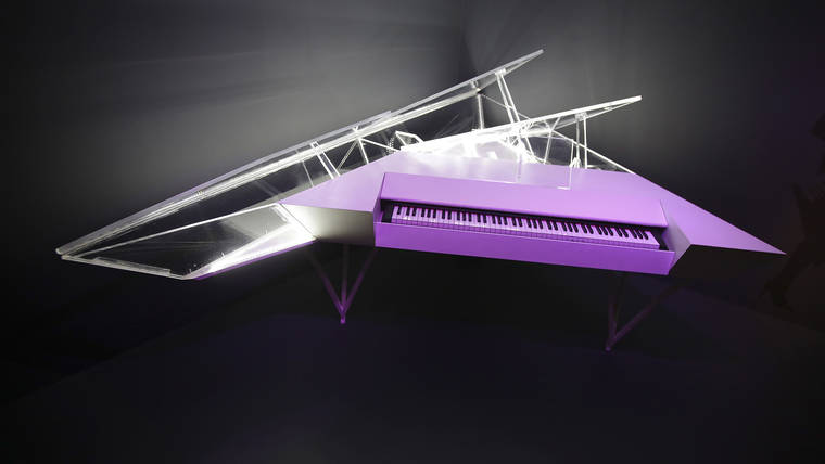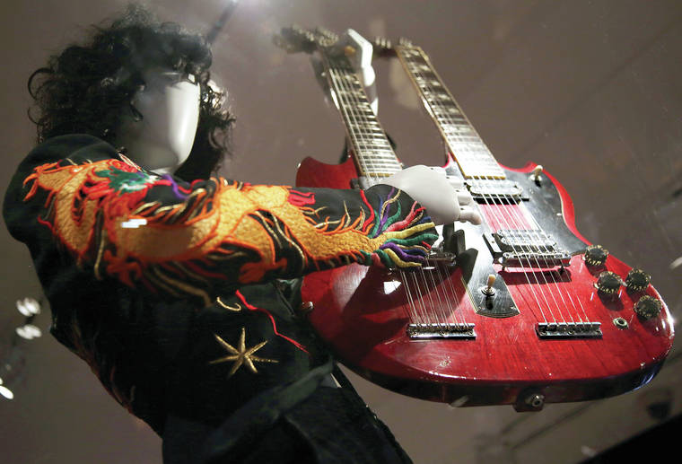 “Creating an Image” opens with an enormous, jagged electric piano housed in acrylic with built-in lights, owned by Lady Gaga. That section also includes Prince’s “Love Symbol” guitar and a dragon-embroidered outfit once worn by Page.