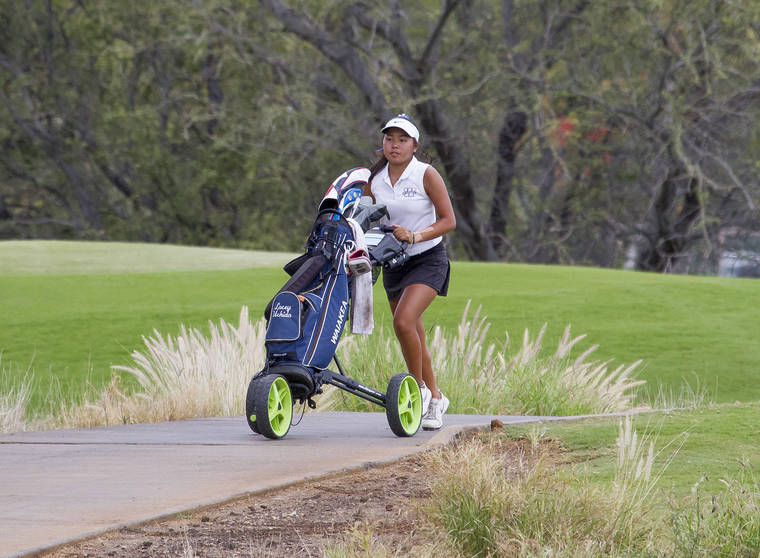 Waiakea's Lacey Uchida walks beside the 15th hole fairway during Round 2 of the BIIF championship tournament at Mauna Kea Golf Club on Monday. (Rick Winters/West Hawaii Today)