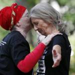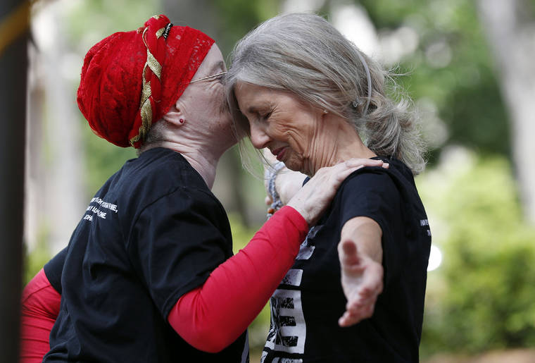 Angel Nolan, left, prays with Mary Francis Abbott at front of the state Capitol in Jackson, Miss., Thursday, May 2, 2019, during the National Day of Prayer. The annual day of observance is held on the first Thursday of May, designated by the United States Congress, calling all people of faith to pray for the nation and its leaders. (AP Photo/Rogelio V. Solis)