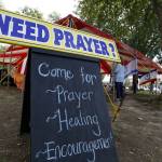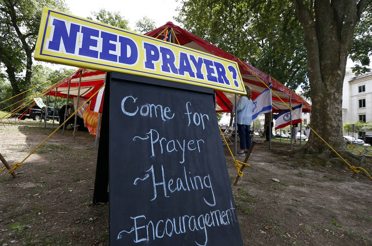 A worshiper enters a prayer tent on the grounds of the state Capitol in Jackson, Miss., Thursday, May 2, 2019, during the National Day of Prayer. The annual day of observance is held on the first Thursday of May, designated by the United States Congress, and calling on people of faith to pray for the nation and its leaders. (AP Photo/Rogelio V. Solis)