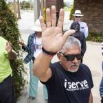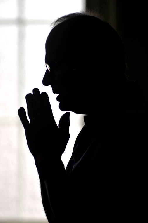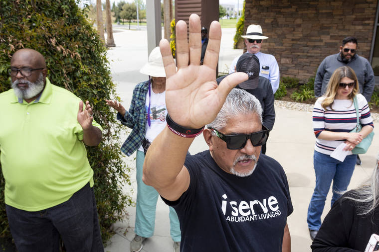 Frank Tafoya raises his hand in prayer during the National Day of Prayer at Hesperia, Calif., City Hall on Thursday, May 2, 2019. (James Quigg/The Daily Press via AP)