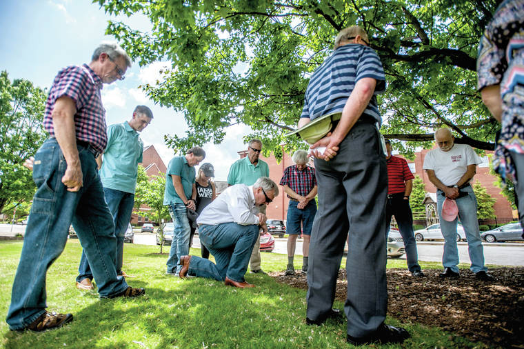 Citizens of Decatur join with Mayor Tab Bowling in Founders Park on Thursday, May 2, 2019 for National Day of Prayer in Decatur, Ala. The annual observance is held on the first Thursday of May, inviting people of all faiths to pray for the nation. (Dan Busey/The Decatur Daily via AP) ▲