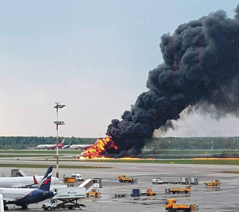 Video broadcast later on Russian television showed flames bursting from the jetliner’s underside as it lands and then bounces. The plane apparently did not have time to jettison fuel before the emergency landing, news reports said.