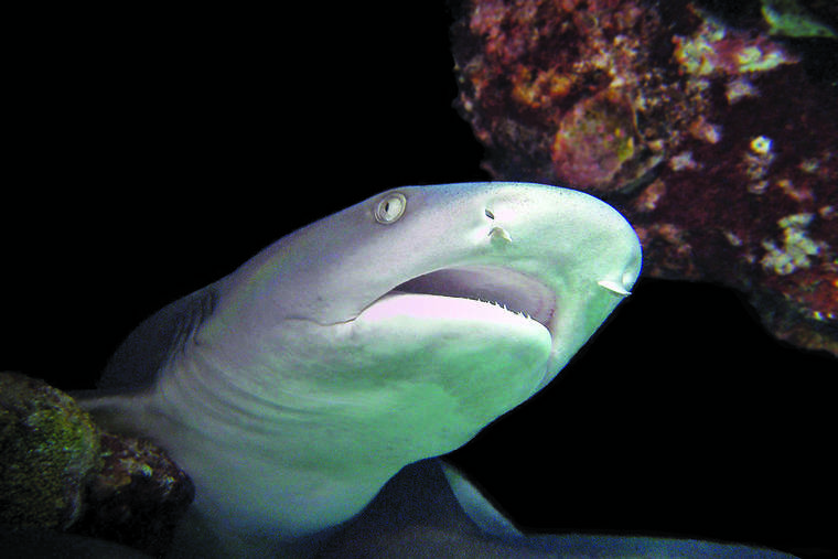 Courtesy of BARRY FACKLER A whitetip reef shark swims out from its lair in Honaunau Bay.