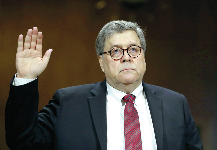 FILE - In this May 1, 2019, file photo, Attorney General William Barr is sworn in to testify before the Senate Judiciary Committee hearing on Capitol Hill in Washington. The House Judiciary Committee is moving ahead with a vote to hold Barr in contempt of Congress despite last-minute negotiations with the Justice Department over access to the full, unredacted version of special counsel Robert Mueller’s report. (AP Photo/Andrew Harnik, File)