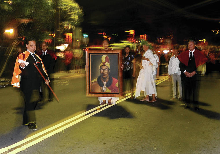 The ceremony commemorated the 200th anniversary of the death of King Kamehameha I. It was marked by a crowd of more than 100, who started a procession while the stars still shined and most of Kailua-Kona slept, from Hale Halawai on Alii Drive to the grounds of Ahuena Heiau.