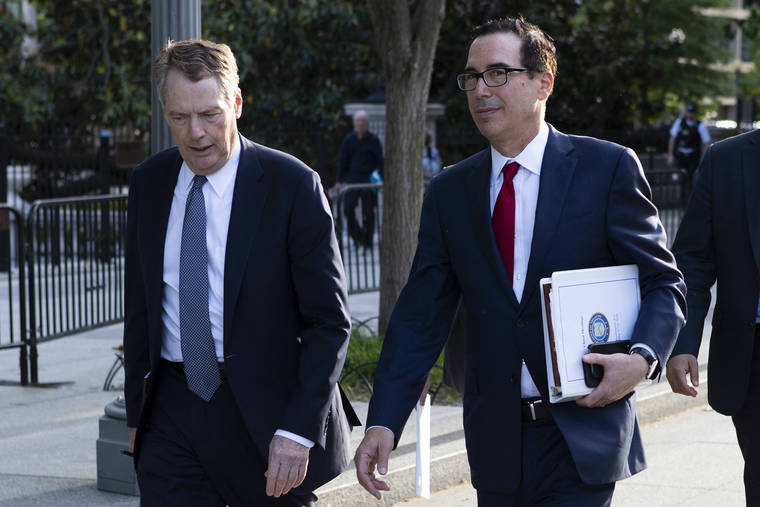 United States Trade Representative Robert Lighthizer, left, and Treasury Secretary Steven Mnuchin walk on Pennsylvania Avenue back to the White House after meeting with Chinese Vice Premier Liu He for trade talks Thursday, May 9, 2019, in Washington. (AP Photo/Jon Elswick)