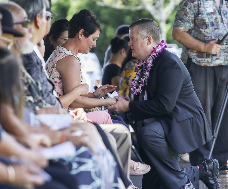 County Managing Director Wil Okabe, representing Mayor Harry Kim, said Hollywood has sold us on the idea of superheroes, and added, “There’s no question that the true heroes are here today before us — not only speaking on behalf of the men and women in blue, but also you, the families of our fallen officers.”