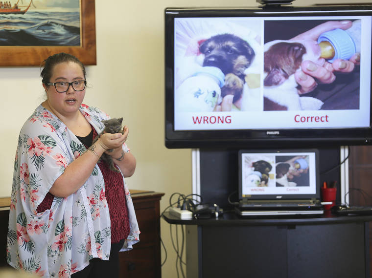 Natasha Hughes holds a kitten while talking Saturday about the wrong and correct ways to feed puppies and kittens. Hughes presented the information during a bottle-feeding kittens and puppies class at 1438 Kilauea Avenue in Hilo. The class helped to ready participants to be volunteer foster parents for baby animals through Rainbow Friends Animal Sanctuary. Contact the sanctuary at 982-5110 for future classes. ▲